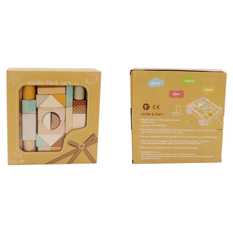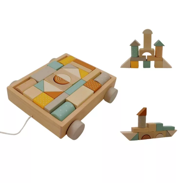 Húzogatós kiskocsi színes építőkockákkal.