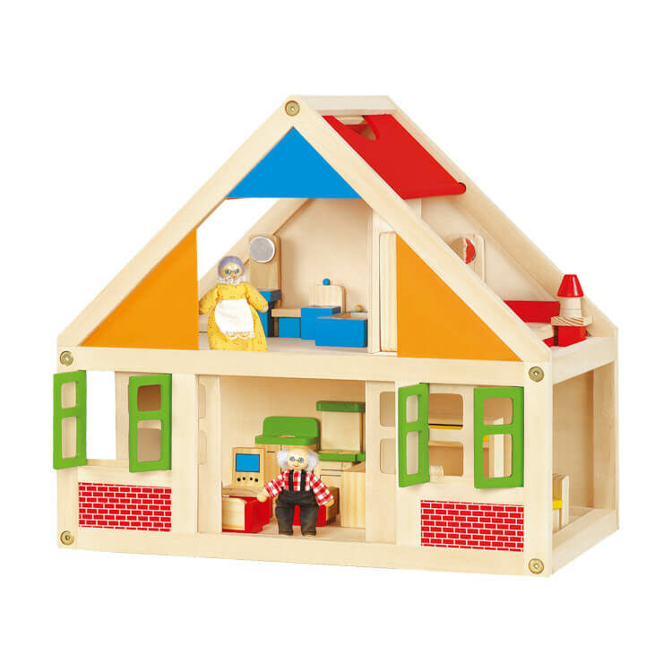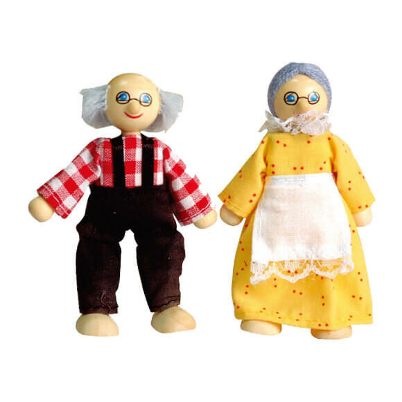 A babaházhoz tartozik egy nagymama és egy nagypapa figura. Szerepjátékokra alkalmas, mellyel fejlődik a gyermek szociális készsége, fantáziája és kreativitása. Méret: 42 x 40 x 26 cm.
