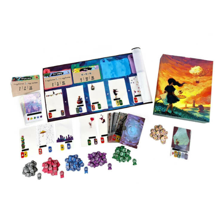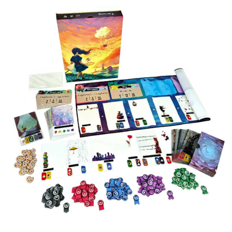 A doboz tartalma: - 60 áttetsző kártya - 1 vászon játékszőnyeg - 100 szalagjelző - 20 festékpaletta-jelölő - 32 nagyméretű kártya - 1 kártyatartó - Magyar nyelvű leírás