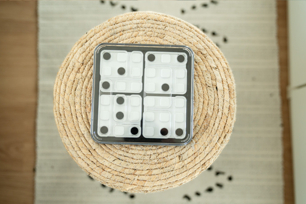 Helyezd el a kirakódarabokat úgy, hogy a fekete pöttyök a feladványban látható helyekre kerüljenek. A dobókocka oldallapokon lévő öttyök száma egyezzen meg a nyilakban jelölt számmal. Minden feladványhoz egyedi megoldás tartozik. Dobókockázatra fel!