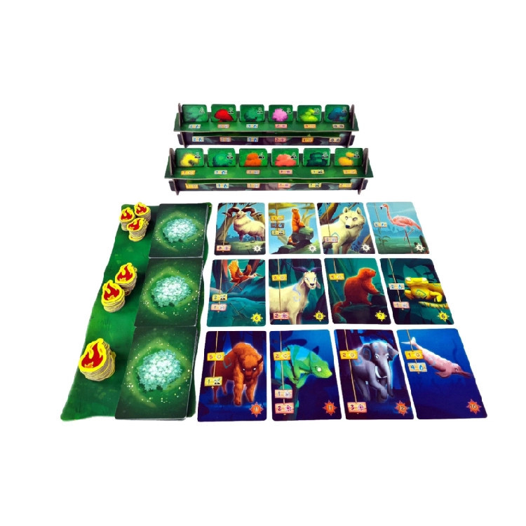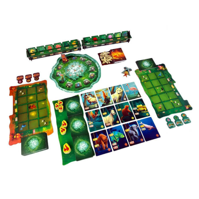 A doboz tartalma: - 1 központ tábla (szellemösvény) - 4 erdőtábla - 14 kezdő őrzőállatkártya mind a 4 erdőszellem számára - 23 első szintű őrzőállatkártya - 16 második szintű őrzőállatkártya - 12 harmadik szintű őrzőkártya - 23 lángvaránuszkártya - 4 erdőszellem kartonfigura - 1 szent fa kartonfigura - 4 kezdő védelmező lapka fa lapka - 2 összerakhat állvány a védelmező fa lapkák számára - 58 tűzjelző, 3 különböző értékben - 20 töredéklapka - 12 győzelmi lapka: 3-3 minden erdőszellemnek - 1 őrzőállattábla - 1 lángvaránusztábla - 39 védelmező fa lapka - Magyar nyelvű leírás