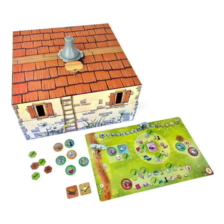 A doboz tartalma: - 1 házdoboz - 1 padlótábla (falakkal és 3D elemekkel) - 2 figura (1 egér és 1 kosár) - 2 kérdéstábla - 14 kérdéslapka - 14 válaszlapka - 10 fa tárgykorong - 1 zsemlámpa - Magyar nyelvű leírás
