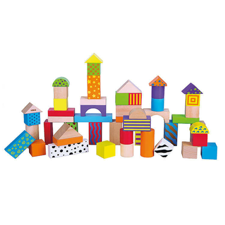 A fa építőkocka 50 db elemet tartalmaz, az alakzatok egyik oldala minden esetben 3 cm.