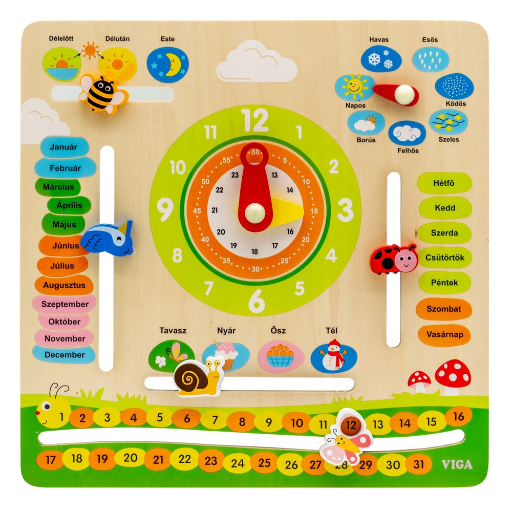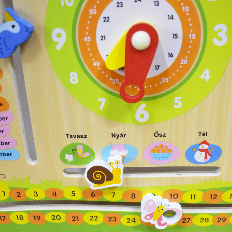 Egy évet 12 hónapra bont a naptár, utána megtanítja a négy évszakot, a hét napjait sorrendbe helyezi (Hétfőtől-Vasárnapig).