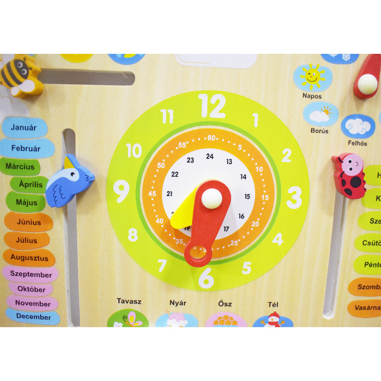 Bemutatja a fontosabb napszakokat szemléltetve a főbb tevékenységekkel. Lehetséges időjárás változásokra megtanítja a gyermeket.