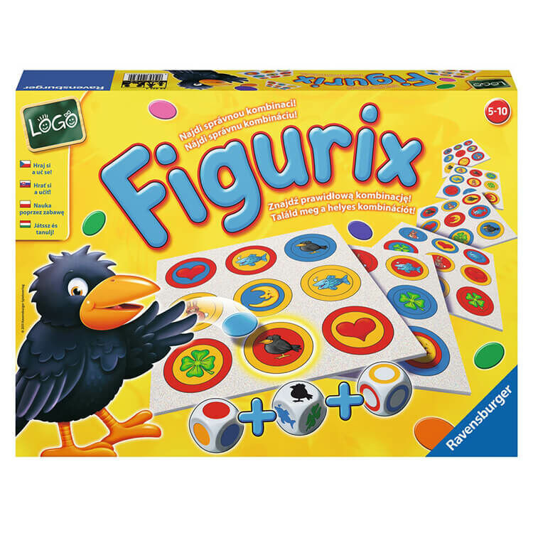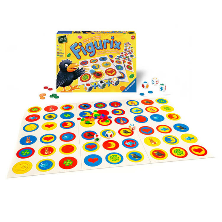A 3 kockán színes szimbólumok láthatók: gyűrűk, körök és figurák. ezekből áll össze egy-egy olyan színes motívum, amely a táblákon csakis egyszer fordul elő.
