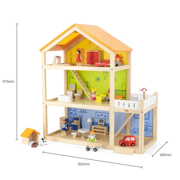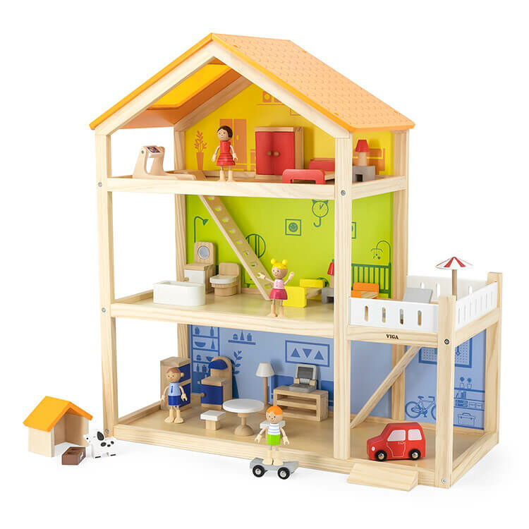 A házhoz hozzátartoznak a bútorok, 4 db baba, gépjármű, kutyaház kutyával.