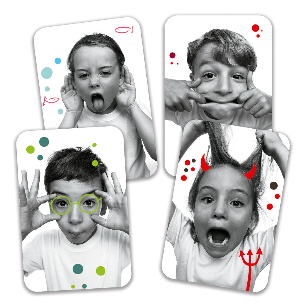 Utánozó, kitaláló játék azonkívül, hogy összekovácsolja a csapattagokat, remek memóriafejlesztő. Az arckifejezések felismerése fontos tudás a kommunikációban. Ebben a kártyajátékban a metakommunikációs jelzések adása és fogadása a játék. Szórakozás és nevetés garantálva!