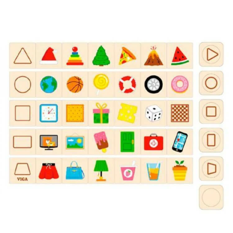 A különböző formákat kell összepárosítani a dobókocka szerint, annak megfelelően melyik kategóriába tartoznak.
