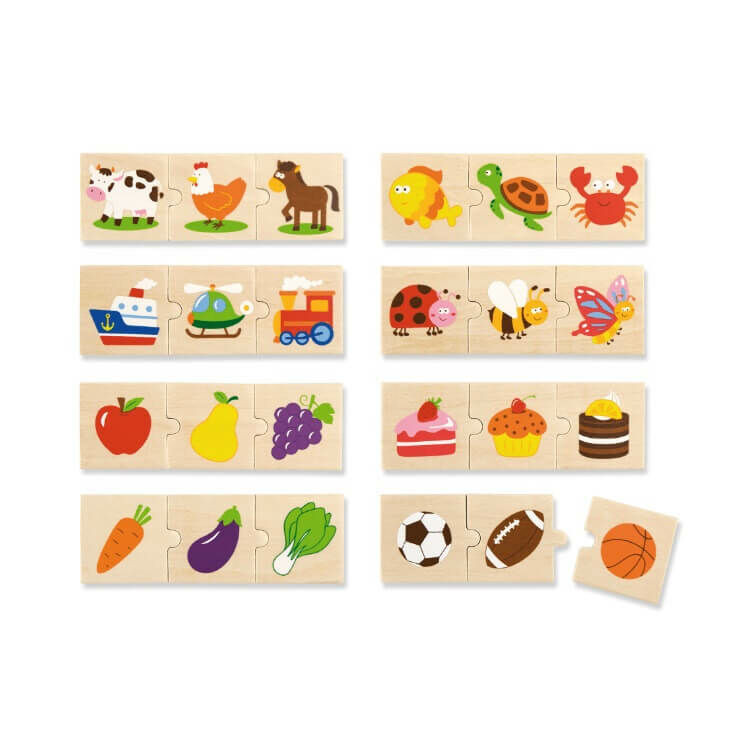 A doboz 24 darab kirakóból áll, melyeken gyümölcsök, zöldségek, állatok, járművek, élelmiszerek, sporteszközök és rovarok találhatóak.