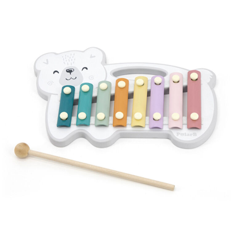 Fából készült jegesmaci formájú játék metalofon 8 darab színes fémlappal. Lehetőséget nyújt a zenélésre már olyan gyermekek számára is, akik még csak most ismerkednek a hangszerekkel.