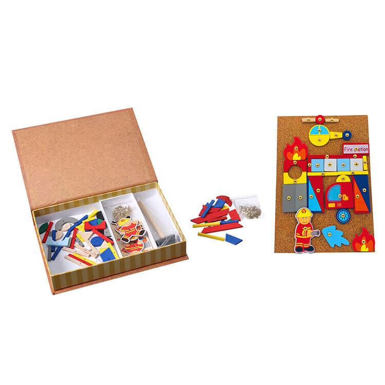 A Tűzoltóság mozaik szett lényege, hogy a kalapács segítségével a parafatáblára kell illeszteni a különböző szegecsekkel ellátott darabokat a feladatkártyák szerint.