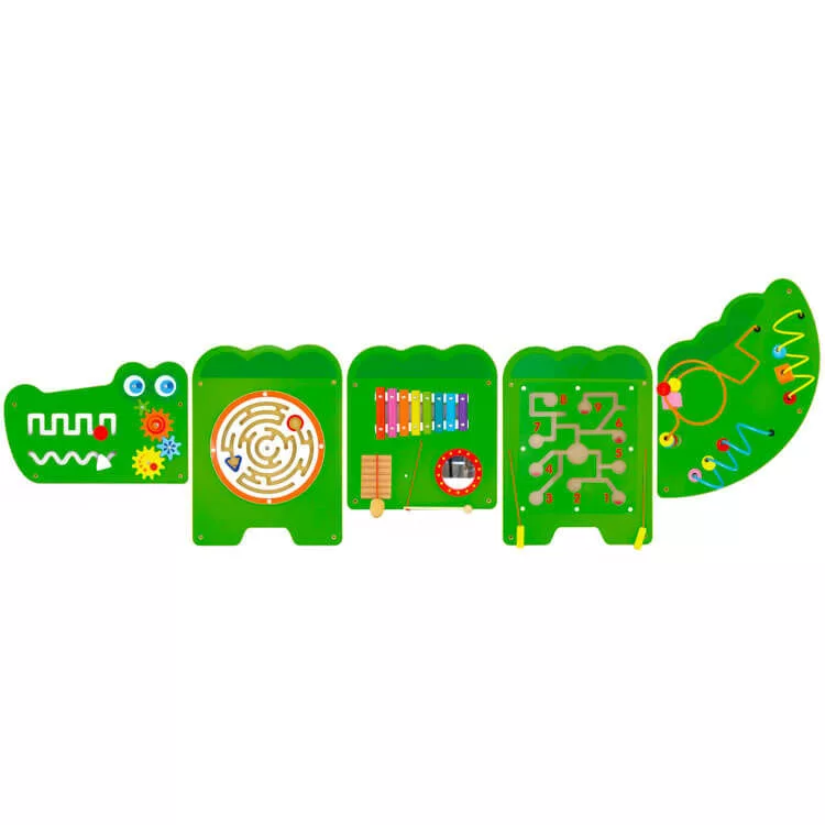 Összetett készségfejlesztő játék, matatófal (falra szerelhető, krokodil). Fejlesztőjáték, mely egyéni és csoportos foglalkozásra egyaránt alkalmas.