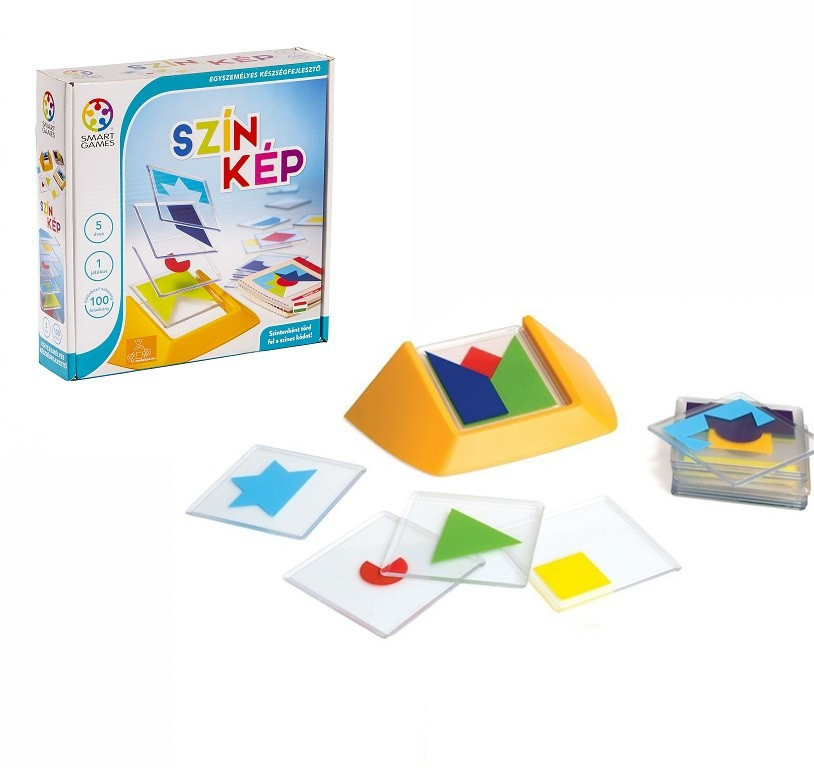 A különböző formákat ábrázoló átlátszó lapkák részben fedik egymást, így újabb és újabb színes formákat hozol létre.
