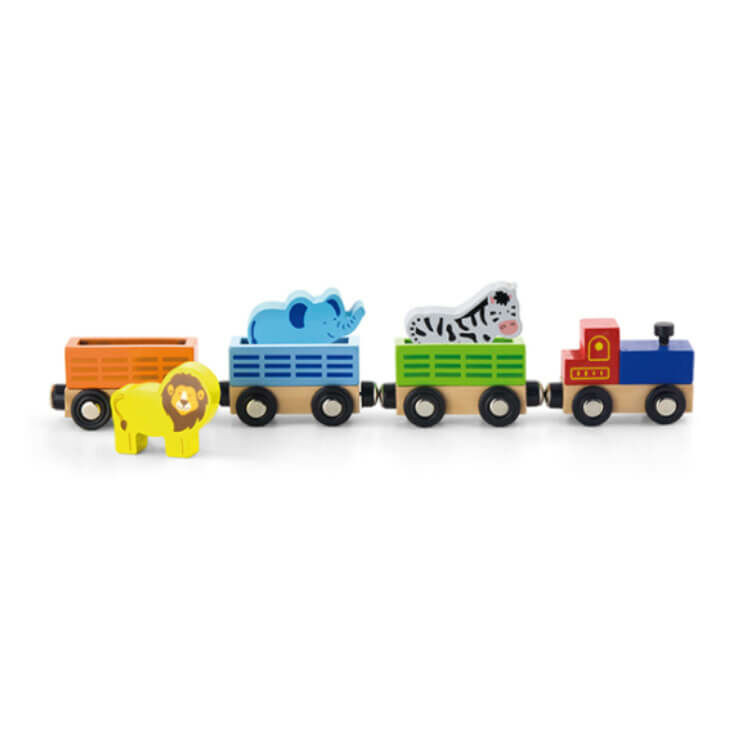 Fából készült színes vonat vadállatokkal. A vagonok mágnessel kapcsolódnak, így könnyen és egyszerűen csatlakoztathatóak egymáshoz.