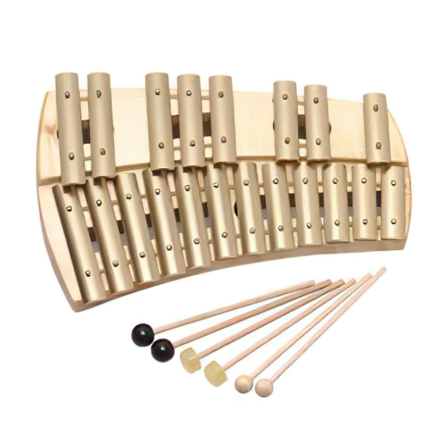 Kromatikus - lekerekített - 20 tónusú. Juharfa, 20 db sárgaréz lemez, 6 db kalapáccsal (fa, gumi, műanyag), választék: c''' - g''''.