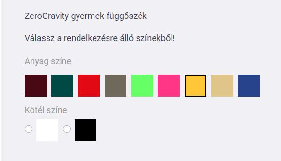 A függőszékek választhatók fekete vagy fehér kötéllel is. A hevederek színe minden esetben fekete.