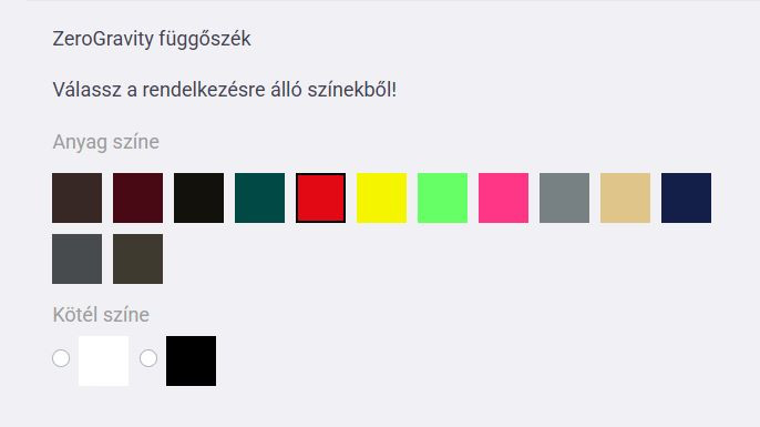 A függőszékek választhatók fekete vagy fehér kötéllel is. A hevederek színe minden esetben fekete.